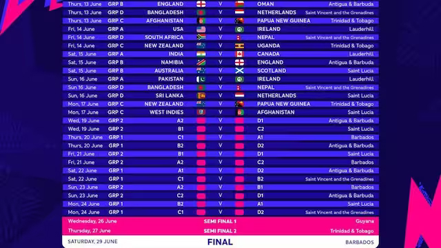 टी20 वर्ल्ड कप 1 जून से शुरू होगा। पहला सेमीफाइनल 26 जून को गुयाना और दूसरा 27 जून को त्रिनिदाद में खेला जाएगा। फाइनल मैच 29 जून को बारबाडोस में होगा। टूर्नामेंट में कुल 55 मैच खेले जाएंगे।