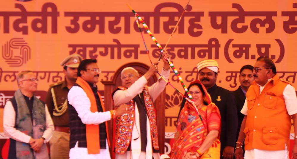 स्थानीय सांसद पटेल द्वारा राज्यपाल पटेल को पारंपरिक जैकेट पहनाकर पारम्परिक धनुष बाण स्मृति चिन्ह के रूप में भेंट किया गया।