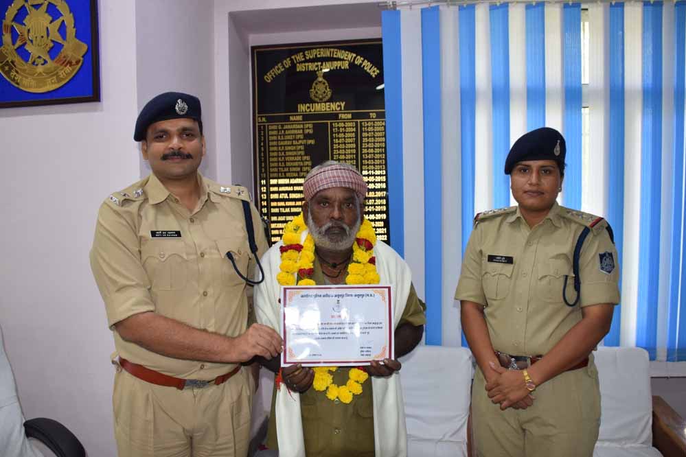 इस प्रकार घायलों की मदद करने वाले तथा यातायात नियमों का पालन करने का संदेश देने वाले ऐसे नेक व्यक्ति को सम्मानित करने हेतु पुलिस अधीक्षक अनूपपुर मोती उर रहमान द्वारा आज अपने कार्यालय में बुलाया गया तथा उन्हें प्रशस्ति पत्र, साल, श्रीफल भेट कर सम्मानित किया ।