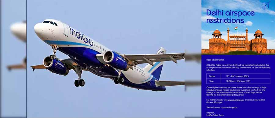 IndiGo एयरलाइंस की ओर से जारी सूचना में बताया गया है कि गणतंत्र दिवस समारोह के मद्देनजर 19 से 26 जनवरी तक दिल्ली की हवाई सीमा में सुबह 10.30 बजे से लेकर दोपहर 12.45 बजे बंद रहेगी. इस वजह से इस समय में दिल्ली आने-जाने वाले विमानों का परिचालन प्रभावित रहेगा.