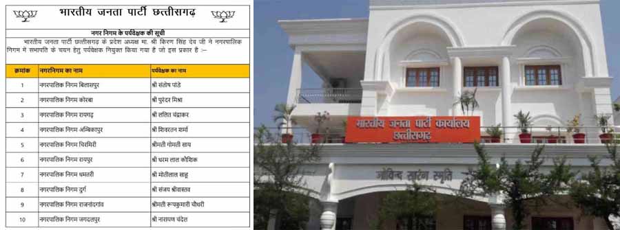नगर पालिकाओं में सभापति का चयन करने भाजपा ने पर्यवेक्षकों की नियुक्ति की है. बिलासपुर के लिए सांसद संतोष पांडेय, कोरबा के लिए विधायक पुरंदर मिश्रा, रायगढ़ के लिए ललित चंद्राकर, अंबिकापुर के लिए शिवरतन शर्मा, चिरमिरी के लिए गोमती साय, रायपुर के लिए धरमलाल कौशिक, धमतरी के लिए मोतीलाल साहू, दुर्ग के लिए संजय श्रीवास्तव, राजनांदगांव के लिए रूप कुमारी चौधरी और जगदलपुर के लिए नारायण चंदेल को पर्यवेक्षक बनाए गए हैं.