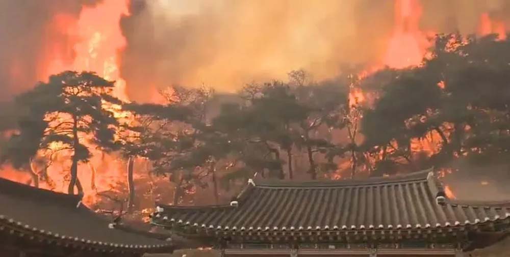 दक्षिण कोरिया के दक्षिण-पूर्वी प्रांत नॉर्थ ग्योंगसांग में लगी अब तक की सबसे बड़ी जंगल की आग पर काबू पाने के लिए अग्निशमन कर्मी हेलीकॉप्टरों का इस्तेमाल कर रहे हैं। इस आग में अब तक 26 लोगों की मौत हो चुकी है और 30 अन्य लोग घायल हुए हैं। सरकारी आंकड़ों के अनुसार, पिछले शुक्रवार से इस क्षेत्र में लगी जंगल की आग ने भारी तबाही मचाई है और लगभग 36,000 हेक्टेयर जंगल जलकर खाक हो गया है।
