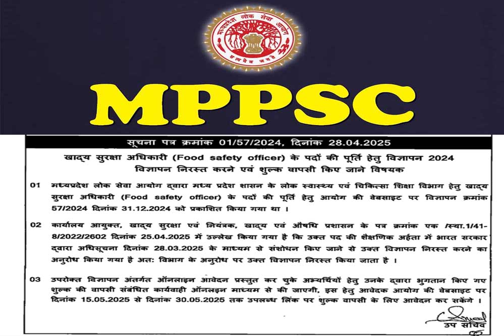 मध्यप्रदेश लोक सेवा आयोग द्वारा इस संबंध में जारी विज्ञप्ति में कहा गया है कि खाद्य सुरक्षा अधिकारी पद की शैक्षणिक योग्यता में भारत सरकार द्वारा संशोधन किया गया है। केंद्र सरकार की इस संबंध में 28 मार्च 2025 को अधिसूचना जारी की गई। अधिसूचना के आधार पर एमपीपीएससी द्वारा ली जानेवाली खाद्य सुरक्षा अधिकारी भर्ती परीक्षा निरस्त की गई है।