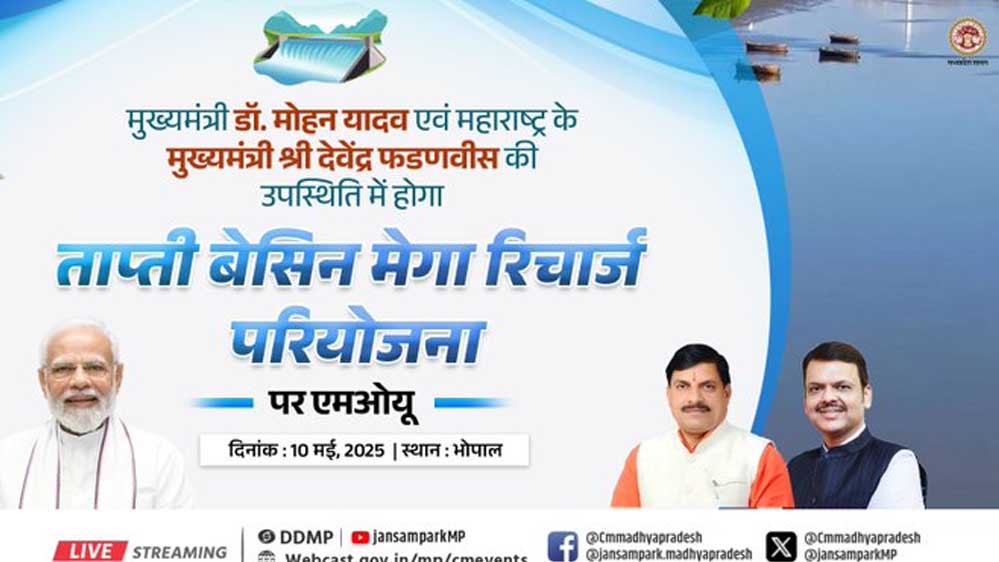 मुख्यमंत्री मोहन यादव और महाराष्ट्र के मुख्यमंत्री देवेंद्र फड़नवीस की मौजूदगी में आज 10 मई को भोपाल में 'ताप्ती बेसिन मेगा रिचार्ज' प्रोजेक्ट का एमओयू होगा. मुख्यमंत्री ने बताया कि केन-बेतवा लिंक परियोजना और पार्वती-कालीसिंध-चंबल लिंक परियोजना के बाद अब मध्यप्रदेश में तीसरी महत्वपूर्ण अंतर्राज्यीय नदी परियोजना 'ताप्ती बेसिन मेगा रिचार्ज परियोजना' पर कार्य होगा. इस अंतर्राज्यीय संयुक्त परियोजना के सभी अवरोध अब दूर हो गए हैं.
