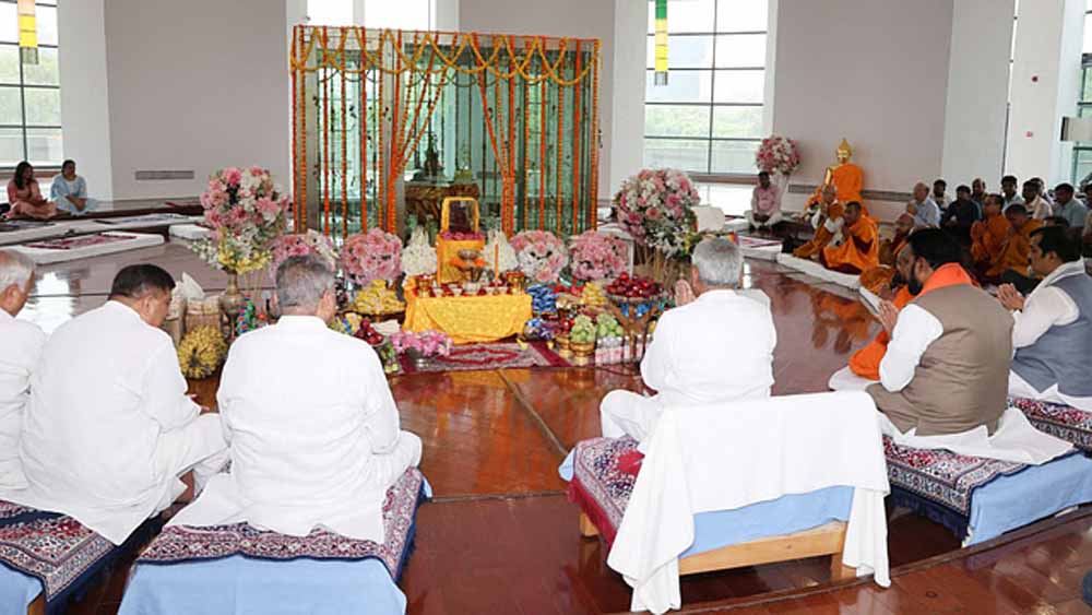 मुख्यमंत्री ने बुद्ध स्मृति पार्क स्थित पाटलिपुत्र करुणा स्तूप में भगवान बुद्ध की पवित्र अस्थि के सामने भगवान बुद्ध की पूजा अर्चना की, परिक्रमा की और ध्यान किया। उन्होंने बौद्ध भिक्षुओं के साथ बैठकर विश्व शांति के लिए मंगल कामना की तथा राज्य एवं देश की सुख, समृद्धि एवं अमन चैन की कामना की।