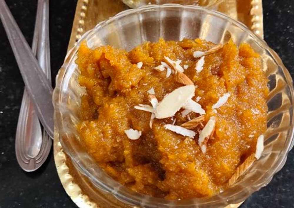 हलवे को कटे हुए मेवे से गार्निश करें और सर्व करें।