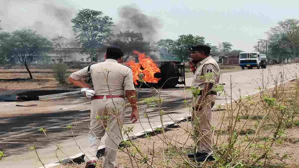 डीजल टैंकर अनियंत्रित होकर पलटा, लगी आग, ड्राइवर और हेल्पर घायल