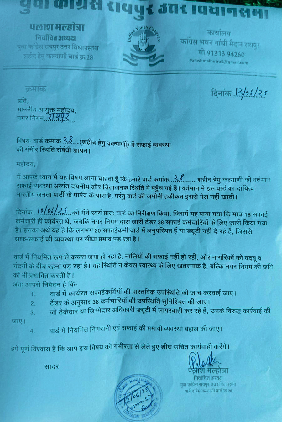 रायपुर। रायपुर उत्तर विधासभा के सभी 18 वार्डों में सफाई व्यवस्था चरमरा गई है। वार्ड 28 शहीद हेमू कल्याणी सहित कई वार्डों में सफाई व्यवस्था बेहद खराब स्थिति में है। 38 में से सिर्फ 18 सफाई कर्मचारी ड्यूटी पर मिले। जगह-जगह कचरा, नालियों में गंदगी और भारी बदबू से लोग परेशान हैं। इसी तारतम्य में रायपुर उत्तर विधानसभा युवा कांग्रेस के निर्वाचित अध्यक्ष पलाश मल्होत्रा ने नगर निगम आयुक्त को ज्ञापन देकर मांग की है कि सभी कर्मचारियों की उपस्थिति सुनिश्चित की जाए और लापरवाही करने पर कार्रवाई हो। इस अवसर पर रायपुर उत्तर विधानसभा युवा कांग्रेस के उपाध्यक्ष शुभम श्रीवास्तव, रायपुर उत्तर विधानसभा महासचिव भुवनेश्वर कुमार, आनंद सोना और दुर्गेश सारथी उपस्थित रहे।