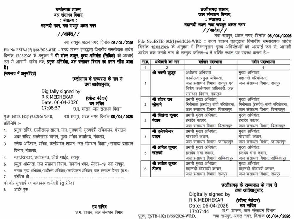 जारी आदेश के अनुसार, शंकर ठाकुर (मुख्य अभियंता, सिविल) को अस्थायी रूप से आगामी आदेश तक प्रमुख अभियंता, जल संसाधन विभाग का प्रभार सौंपा गया है। साथ ही 6 मुख्य अभियंताओं की नई पदस्थापना की गई है।