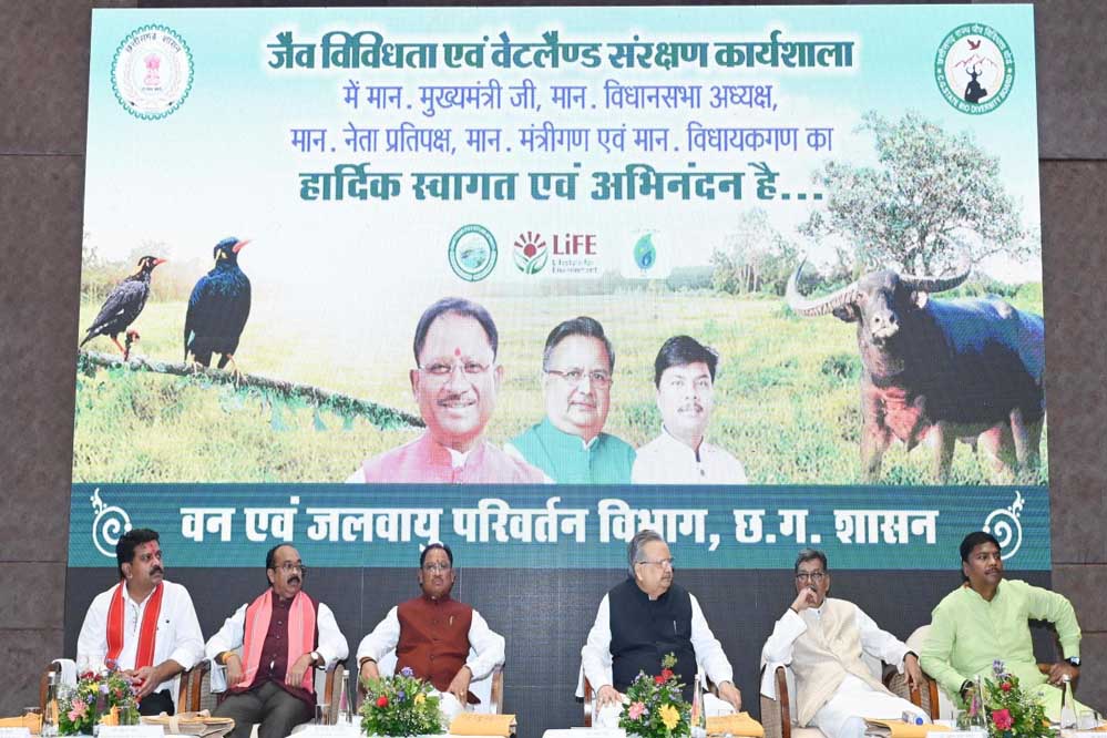 जैव विविधता एवं आर्द्रभूमियों (वेटलैण्ड्स) के संरक्षण के उद्देश्य से आज नवा रायपुर स्थित दण्डकारण्य अरण्य भवन में एक उच्चस्तरीय कार्यशाला का आयोजन किया गया। इस अवसर पर मुख्यमंत्री विष्णु देव साय, विधानसभा अध्यक्ष डॉ. रमन सिंह, नेता प्रतिपक्ष डॉ. चरणदास महंत, उपमुख्यमंत्रीद्वय अरुण साव एवं विजय शर्मा सहित कैबिनेट के सभी मंत्री एवं विधायकगण उपस्थित थे।
