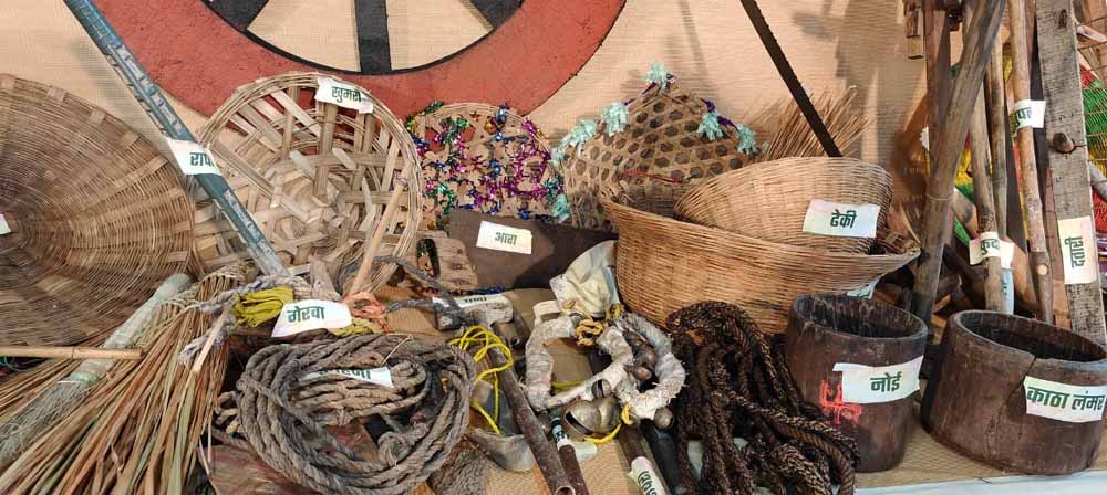 सबसे बाईं ओर दो गोलनुमा लकड़ी की संरचनाएँ रखी गई थीं, जिन्हें ‘काठा’ कहा जाता है। पुराने समय में जब गाँवों में धान तौलने के लिए काँटा-बाँट प्रचलन में नहीं था, तब काठा से ही धान मापा जाता था। सामान्यतः एक काठा में लगभग चार किलो धान आता है। काठा से ही धान नाप कर मजदूरी के रूप में भुगतान किया जाता था।