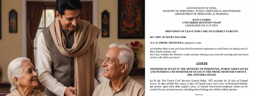 केंद्रीय मंत्री जितेन्द्र सिंह ने राज्यसभा में एक सवाल के जवाब में बताया कि केंद्रीय सिविल सेवा (छुट्टी) नियम, 1972 में अन्य पात्र छुट्टियों के अलावा, केंद्र सरकार के कर्मचारियों को प्रति वर्ष 30 दिन की अर्जित छुट्टी, 20 दिन की आधे वेतन की छुट्टी, 8 दिन की आकस्मिक छुट्टी और 2 दिन की प्रतिबंधित छुट्टी का प्रावधान है। इसका लाभ वे अपने बुजुर्ग माता-पिता की देखभाल सहित किसी भी व्यक्तिगत कारणों से उठा सकते हैं।