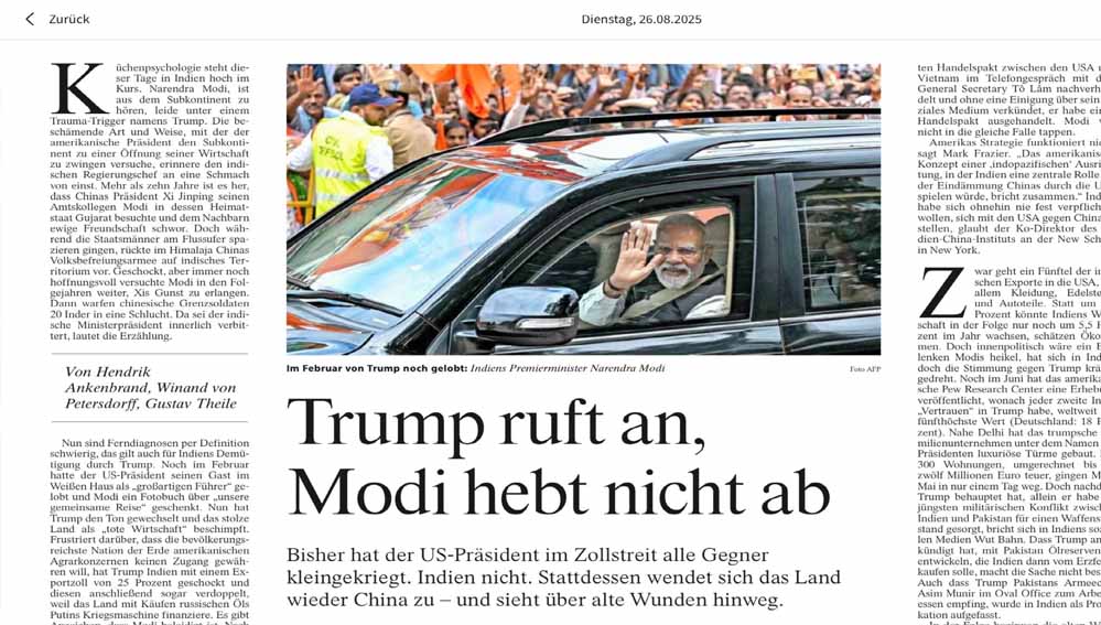 जर्मन अखबार Frankfurter Allgemeine Zeitung ने अपनी एक विस्तृत रिपोर्ट में ऐसा दावा किया है। रिपोर्ट में कहा गया है कि ऐसा लगता है कि डोनाल्ड ट्रंप के रुख से परेशान भारत सरकार अब उनसे कोई आसान डील नहीं करना चाहती। अखबार के लिए हेंड्रिक अंकेनब्रांड, विनांड वॉन पीटर्सडॉर्फ, गुस्ताव थाइले ने लिखे अपने आर्टिकल में कहा कि यह भारत सरकार की बदली हुई नीति का प्रतीक है कि उसने उस चीन के साथ भी रिश्ते बेहतर करने शुरू किए हैं, जिससे 2020 में लद्दाख में सैन्य झड़प हुई थी और 20 भारतीय सैनिक शहीद हो गए थे।