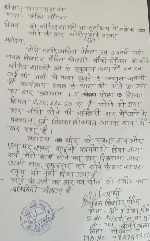 जानकारी के अनुसार, बांकी मोगरा निवासी नवल किशोर पंडित की पत्नी अमिता पंडित श्री धीरेंद्र शास्त्री के हनुमान कथा कार्यक्रम में शामिल होने गई थीं। कार्यक्रम समाप्त होने के बाद जब वह घर लौटीं, तब उन्हें पता चला कि उनके गले से लगभग 1.5 तोला सोने का हार चोरी हो गया है। चोरी हुए हार की कीमत करीब 2,15,664 रुपये बताई जा रही है।