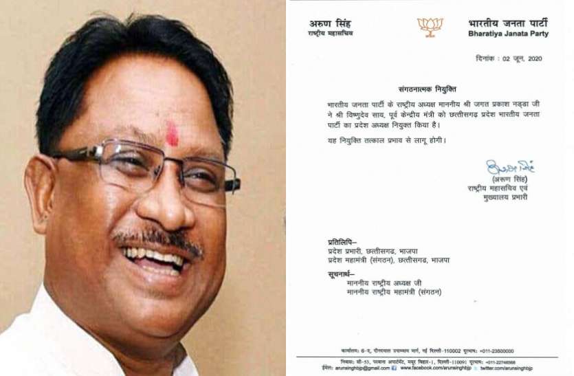 रायपुर। भाजपा के वरिष्ठ नेता व पूर्व केन्द्रीय मंत्री रहे विष्णुदेव साय को छत्तीसगढ़ भारतीय जनता पार्टी के प्रदेश अध्यक्ष पद पर नियुक्त किया गया है। इससे पूर्व विक्रम उसेंडी यह जिम्मेदारी संभाल रहे थे।