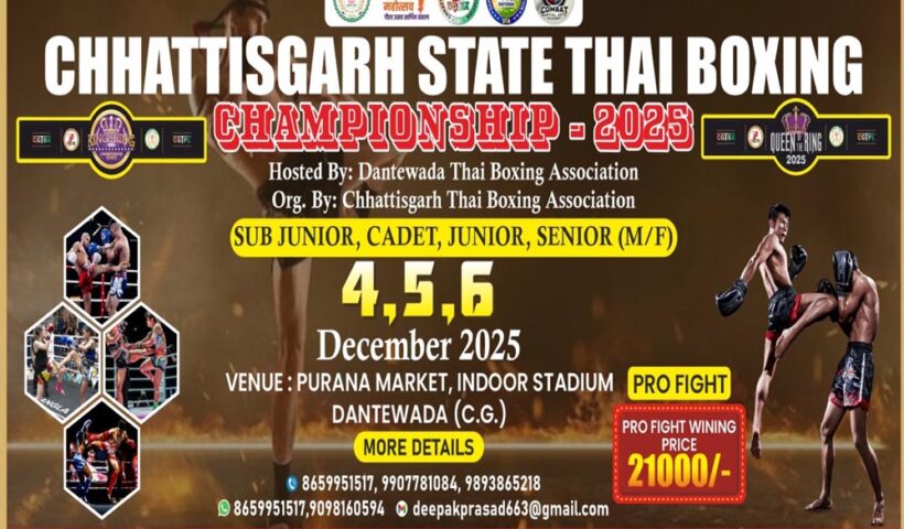 दंतेवाड़ा जिला प्रशासन एवं खेल एवं युवा कल्याण विभाग के तत्वावधान में राज्य स्तरीय थाई बॉक्सिंग चैंपियनशिप–2025 का आयोजन पुराना मार्केट स्थित इंदिरा स्टेडियम, दंतेवाड़ा…